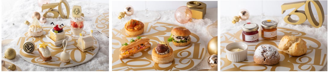 6階「ザ・ラウンジ」では、フランク ミュラーが持つ芸術性と独創性、そしてスイスという両ブランドの共通点からインスピレーションを受け、白銀に染まる美しいスイスアルプスの景色を彷彿とさせるラグジュアリーなホワイトクリスマスをアフタヌーンティーで表現。ホワイトとゴールドを基調としたプレートには、フランク ミュラーを象徴するケースフォルムであるトノウ型に模られた30周年記念ロゴを配したパンナコッタやマスカルポーネとコーヒーで大人の味に仕上げたブッシュドノエル、時計の文字盤に使われている”ビザン数字”がデザインされた煙突にサンタが飛び込んでいる様子がキュートなバニラとラズベリーのムースケーキなど、遊び心も少し加えたスイーツが並びます。セイヴォリーには蟹とマンゴーのエクレアやトリュフを使ったベーグル、そしてスコーンにはヨーロッパでのこの季節の伝統菓子・シュトーレン風スコーンなど、フェスティブと高級感を同時に堪能できるラインナップをご用意いたしました。