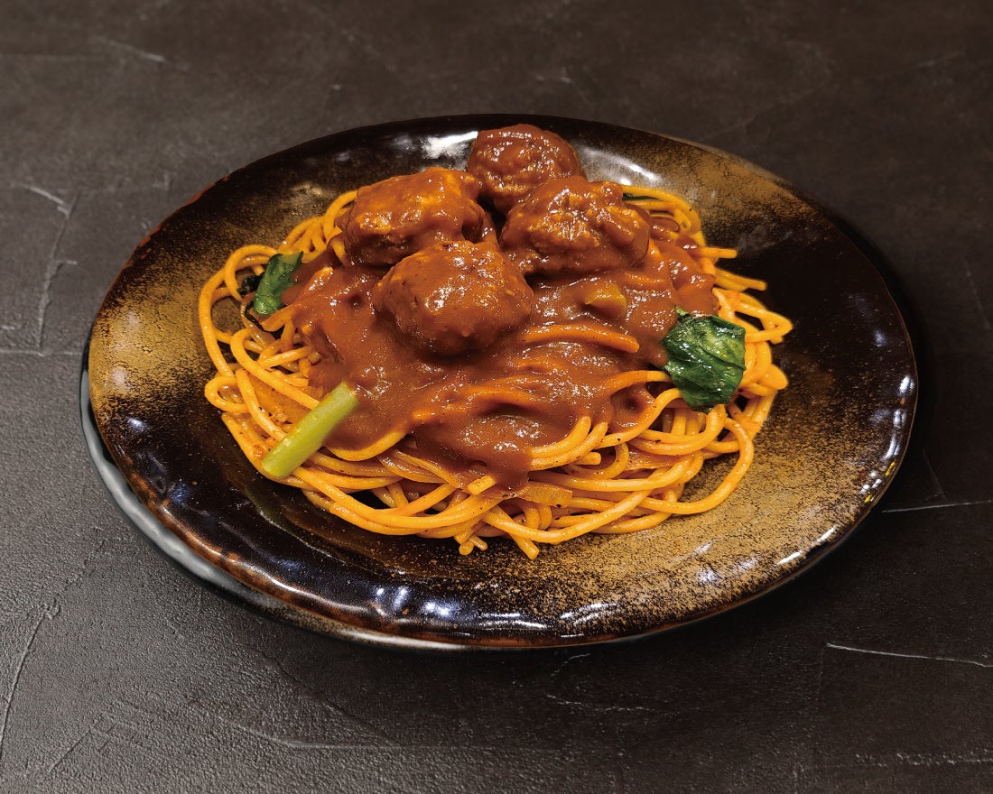 そのロメスパバルボアから、このたび期間限定で登場するスペシャルメニューが、お弁当の定番おかずとして子供から大人まで絶大な人気を誇るミートボールをメインに据え、その大きめサイズから敢えて「肉団子」と命名した逸品「ドミグラ肉団子」です。特製ドミグラスソースで煮込んだボリューム感ある肉々しいミートボールと、香ばしく炒めあげたもちもち食感の極太スパゲティを合わせました。ソースとスパゲティを豪華に混ぜ、ミートボールを崩しながら食せば、ミートソース風の楽しみ方もできます。