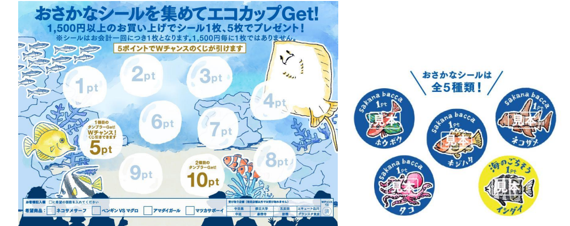- シール5点を集めてエコカップ引換券をsakana bacca店舗で受け取る