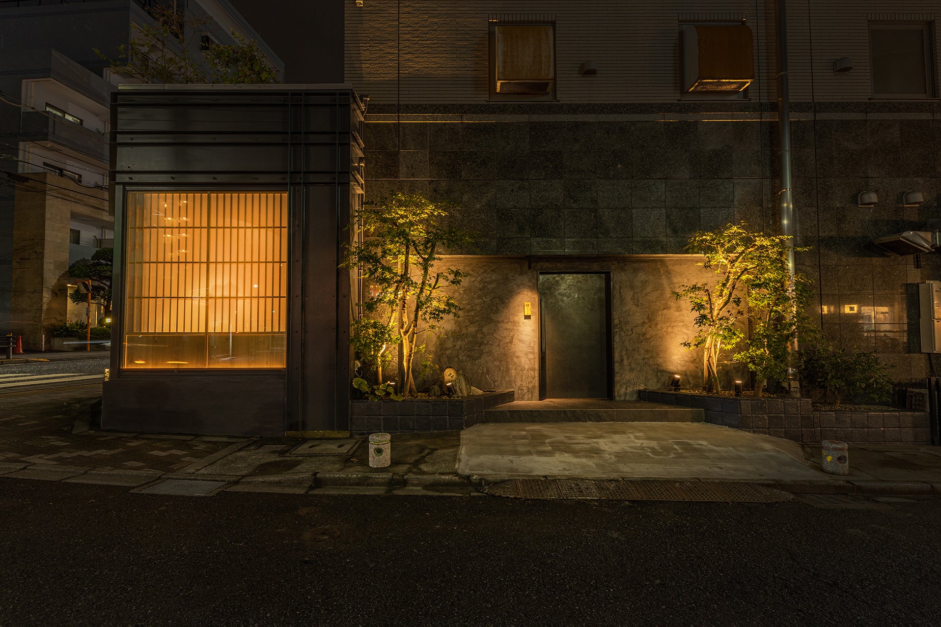 内装デザインテーマは「力強さ」と「丁寧さ」。前に記述したように武相の地域の特性である寛容さを下支えする「力強さ」という点も着目したい。濃い目でグレイッシュな石肌やカウンターテーブルのひのき一枚板は力強さの表現。また日々変化して味わいを出す銅板で寛容さや丁寧さも表現されている。上質で落ち着いた雰囲気の中に潜む唯一無二の個性を是非感じていただきたい。