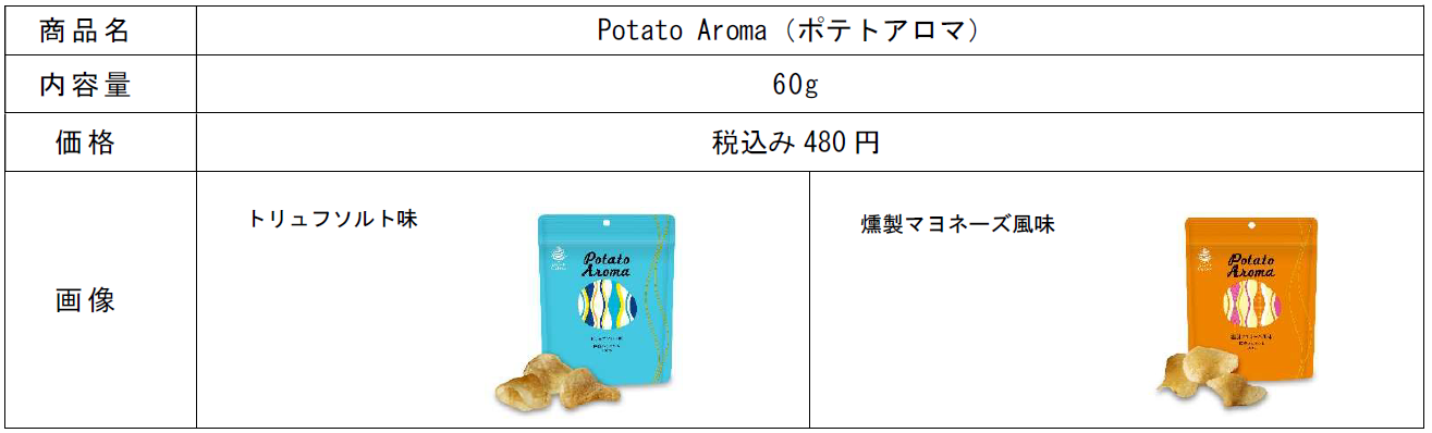 ●「Potato Aroma」は、堅めの食感とともに、噛みしめるたびに香りが楽しめるシリーズです。くせのないひまわり油でフライすることで、素のじゃがいもの味を活かし、「香り」立つフレーバーで味つけしています。日本各地の様々な品種・産地のじゃがいもを季節によって順次変更しながら使用します。