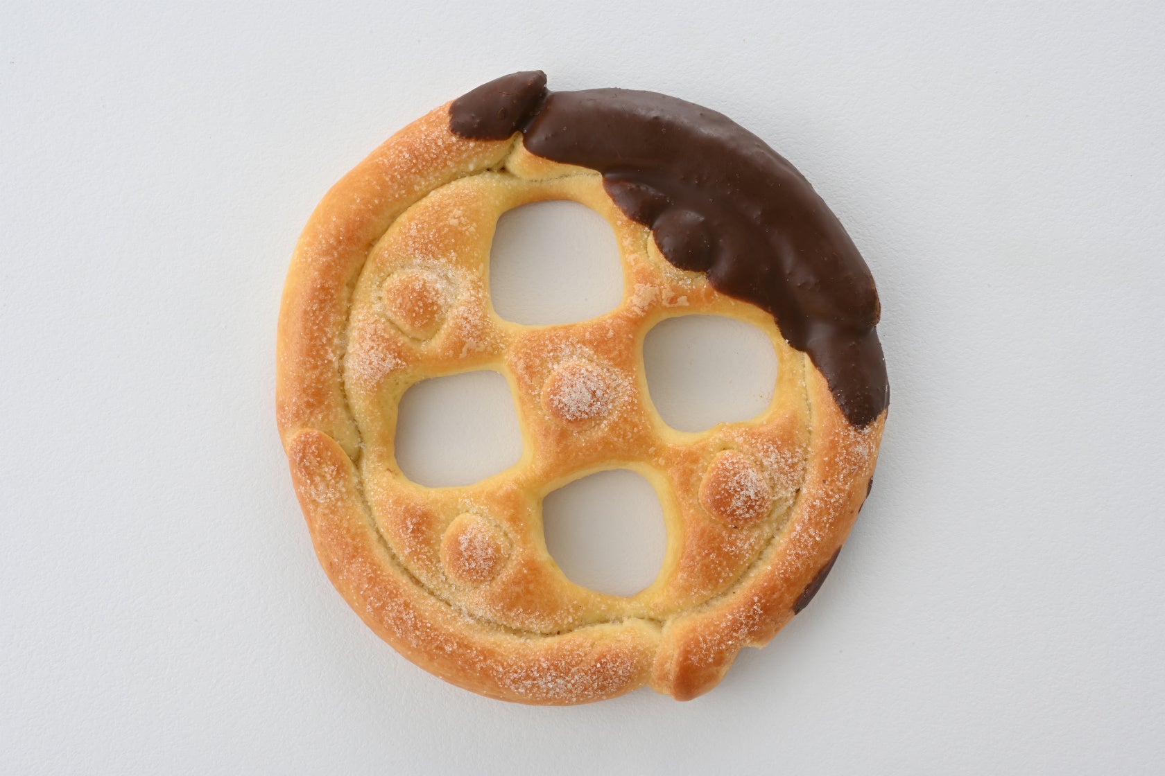 SLの動輪をかたどったパン。ほんのり甘いブリオッシュ生地に砂糖をまぶし、チョコレートで仕上げました。