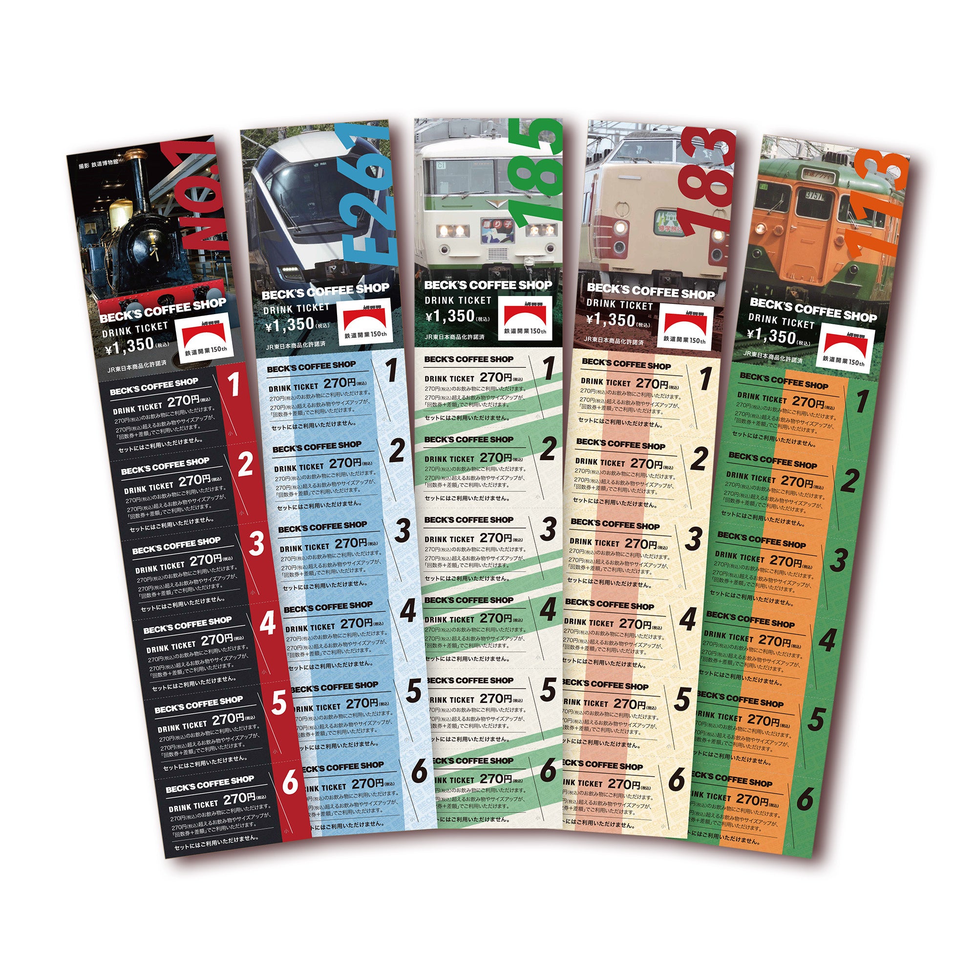 5杯分の価格で6杯お楽しみいただけるドリンク回数券を、限定デザインにて販売。東海道線に縁のある鉄道を中心に、5種類用意しました。