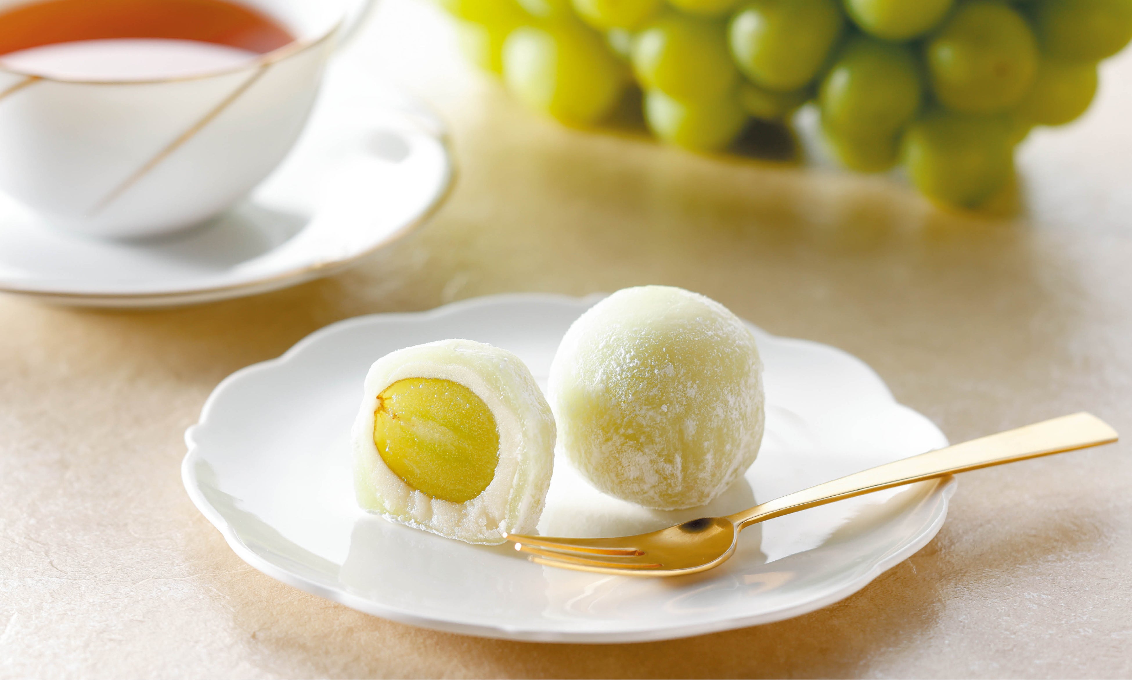 シャインマスカットは産直の山梨県産を使用。12g以上の大きさのもののみを選定しております。果実の周りにはシャインマスカットの甘さを活かすために※糖度を51%まで抑えた白餡をまとわせました。生地には白玉を使用し、なめらかな食感に。一口かじるとまるまる一粒皮ごと使用したフレッシュなシャインマスカットの強い甘味と芳醇な香り、みずみずしいジューシー感が口いっぱいに広がります。白餡のコクがより果実の味わいを引き立てます。
