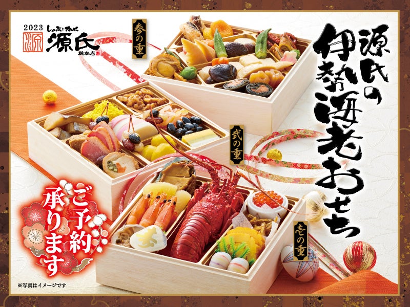 株式会社物語コーポレーション(本社:愛知県豊橋市/代表取締役社長:加藤 央之)が展開する『しゃぶとかに 源氏総本店 向山店』『しゃぶとかに 源氏総本店 南越谷店』は、2022年12月20日(火)まで、「源氏 伊勢海老おせち-三段重-」(送料無料)の予約をwebもしくは店頭、お電話にて承ります。