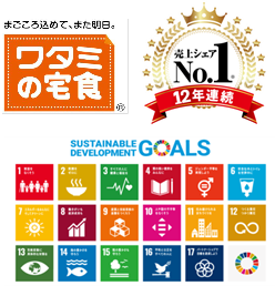 「ワタミの宅食」は、日替わりのお食事と“まごころ”をお届けすることで“社会を支えるインフラ”となることを目指し、事業を展開しています。お弁当・お惣菜は、お客さまと同じ地域に住む“まごころスタッフ”がお届けしています。毎日約24万食のお弁当・お惣菜をお届けしており、病者・高齢者食宅配市場「売上シェア12年連続 No.1」※(2010年~2021年)を達成しています。2020年3月には、業界として初めて、自社弁当容器を回収し、新たな容器としてリサイクルする取り組みを全国に展開するなど、SDGsの目標達成にも貢献しています。