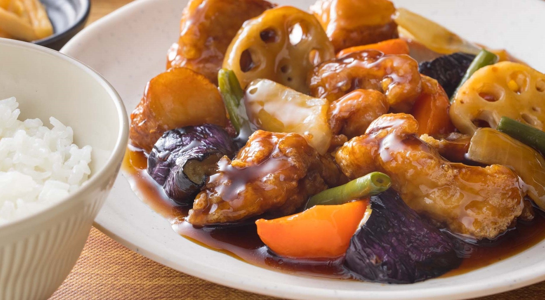 不動の人気NO.1メニュー!玄米黒酢と黒糖に、りんご酢で味を調えた、大戸屋オリジナルの黒酢あん。