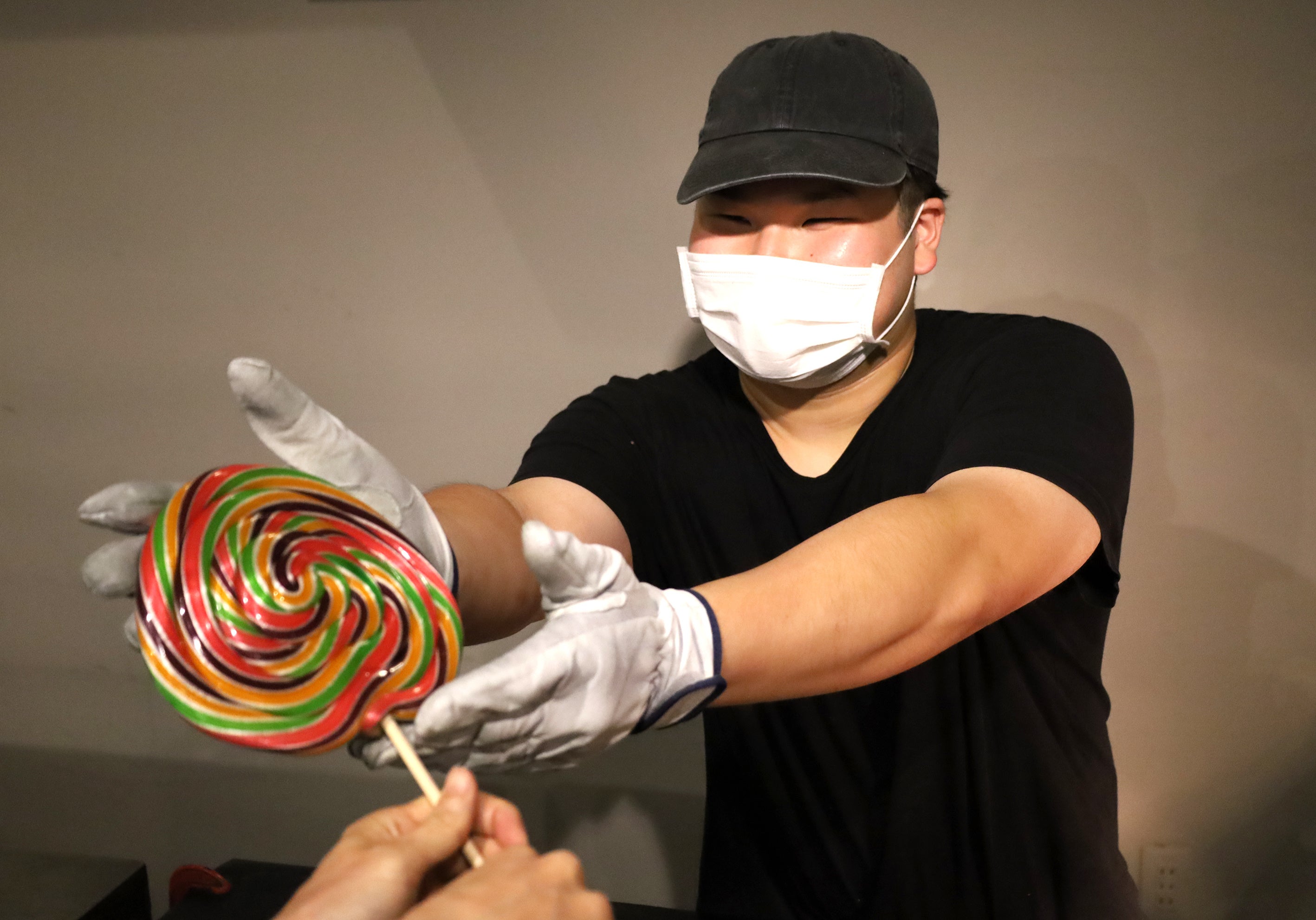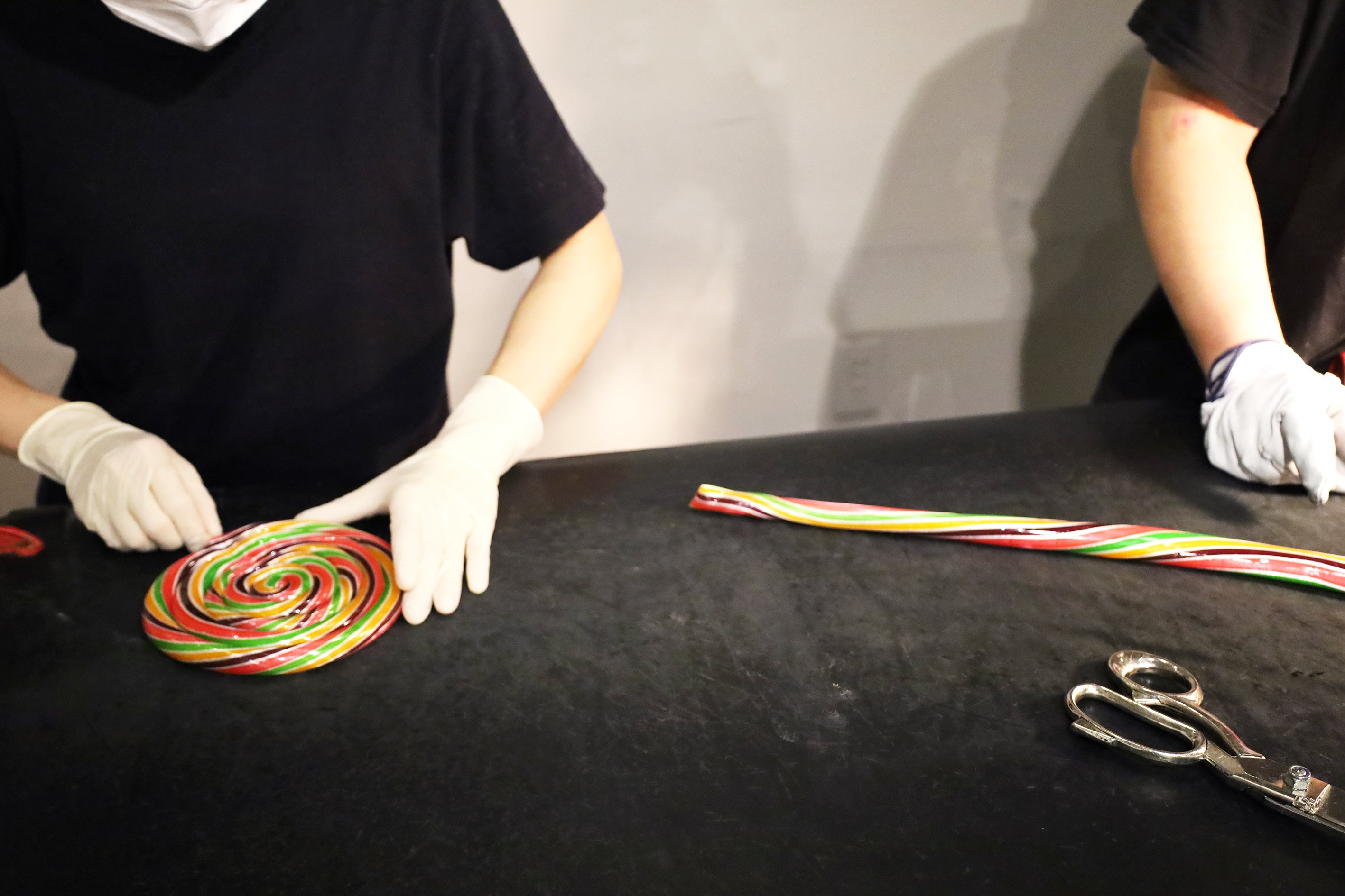 プレゼントしたい相手とキャンディ製造を見学していると、職人がその場で大きなロリポップを作り上げて、出来立てを手渡しでプレゼントしてくれます。