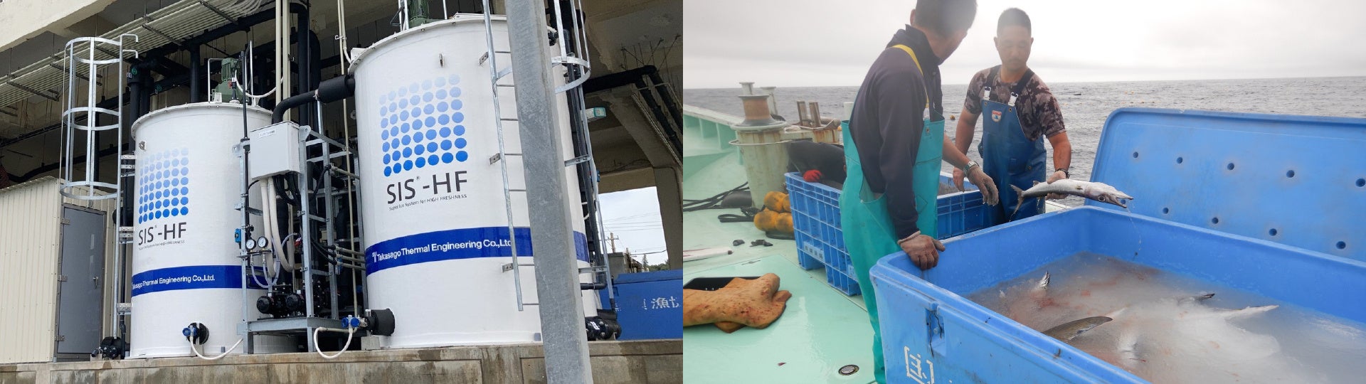 (画像左:SIS-HFⓇ 国頭漁業協同組合での設置状況/画像右:船上でのシャーベットアイス利用状況)