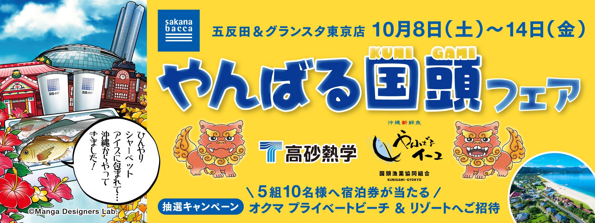 生鮮流通のDXを推進する株式会社フーディソン(本社:東京都中央区、代表取締役CEO:山本徹、以下当社)は、2022年10月8日(土)から10月14日(金)の7日間、沖縄本島最北端の漁協である国頭(くにがみ)漁業協同組合と協業し、当社運営の魚屋「sakana bacca」2店舗(五反田・グランスタ東京店)で『やんばる国頭フェア』を開催します。フェア期間中、魚の鮮度を通常の氷よりも保持できるシャーベットアイスにより高鮮度で運ばれる首都圏では珍しい鮮魚をはじめ、国頭村の産品を販売します。
