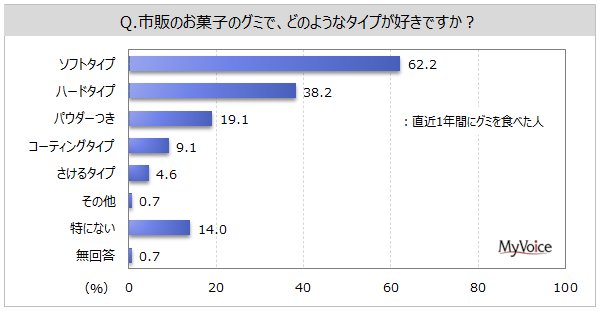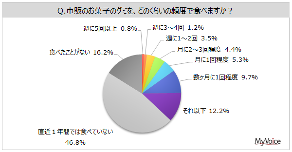 | https://myel.myvoice.jp/products/detail.php?product_id=29002 ※上記設問の他に「直近1年間に食べたグミの銘柄」「グミサプリの利用状況」なども聞いています。 |