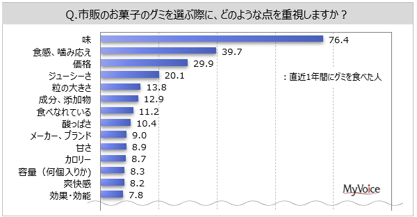■直近1年間にお菓子のグミを食べた人の重視点は、「味」が8割弱、「食感、噛み応え」が4割、「価格」「ジューシーさ」が各20%台。「味」「食感、噛み応え」は女性で比率高い