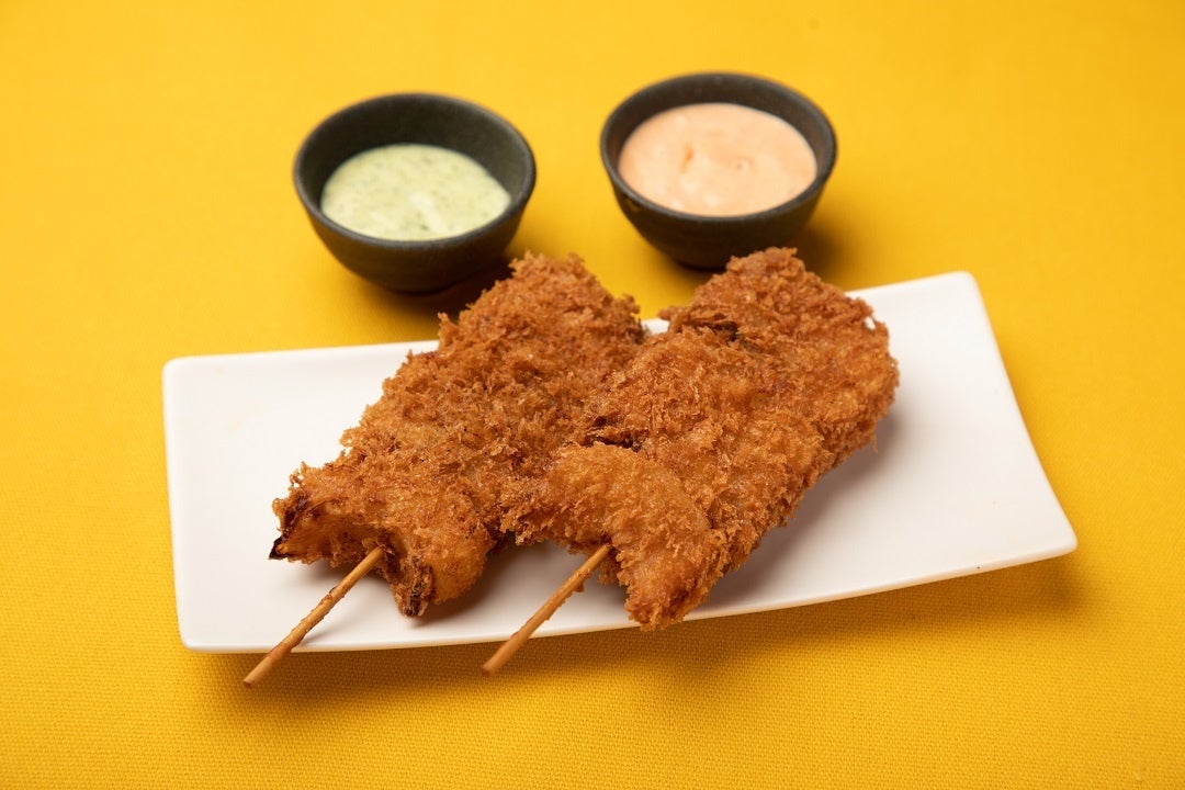 カツオと甘みのある玉ねぎを串刺しにして揚げました。トマトとバジルの2種のソースで楽しめます。