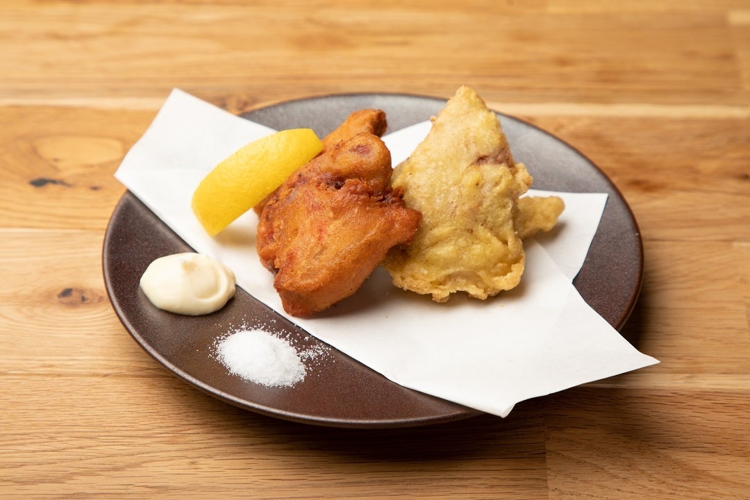 カツオの天ぷらと梅肉風味の唐揚げの2種類を盛り合わせに、シンプルに塩とマヨネーズでどうぞ。