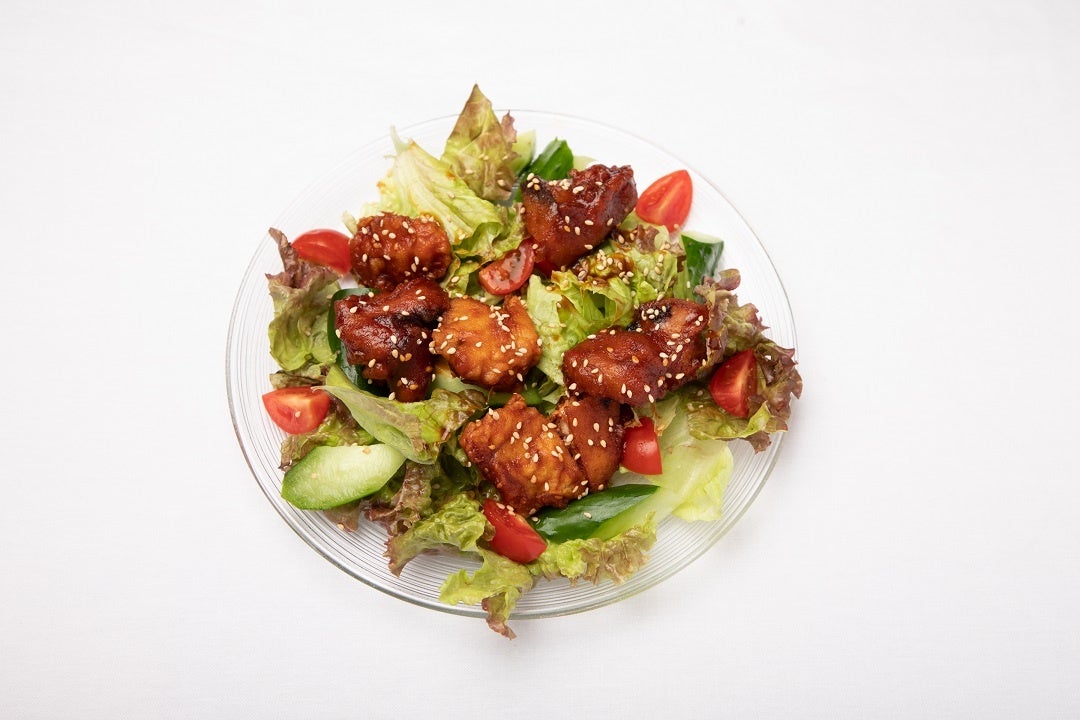 カツオの竜田揚げをコチュジャンなどと混ぜ合わせてヤンニョム風に。食欲そそるサラダです。
