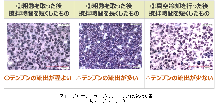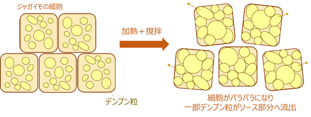 研究の結果、じゃがいもを蒸した後に粗熱を取って(40℃)、適度に撹拌すると、ソース部分へデンプンが程よく分散することが分かりました。