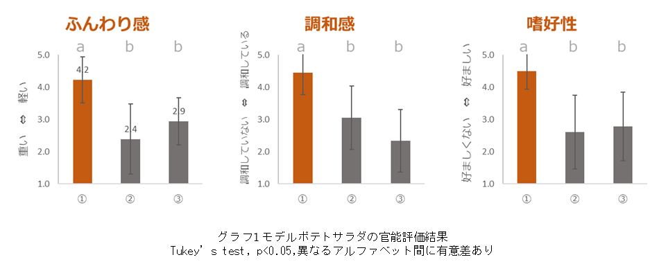 顕微鏡観察の結果、撹拌条件によって、ソース部分へのデンプンの流出度合いに差がみられました(図1)。また、官能評価の結果から①のサンプルは食感がふんわりし、味の調和感が高く、嗜好性も高いことが分かりました(グラフ1)。これは、温かいほどじゃがいもの細胞が崩れてソース中にデンプン粒が流出しやすくなり、マヨネーズソースとデンプン粒が混ざり合うことで物性が変化するためだと考えられます。