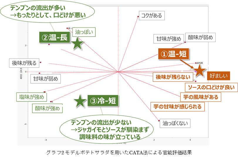 ①は、じゃがいもの風味が感じられてソースの口どけが良く、調和感があるという評価でした。一方で、②はソースの口どけが悪く、油っぽい評価であり、③は酸味や塩味が強く、じゃがいもの風味が感じられない評価でした。これは、②はデンプンの流出が多く、ソースがもったりとする一方で、③はデンプンの流出が少なく、じゃがいもとマヨネーズソースが馴染まず、味がバラバラと感じられるためだと考えられます。