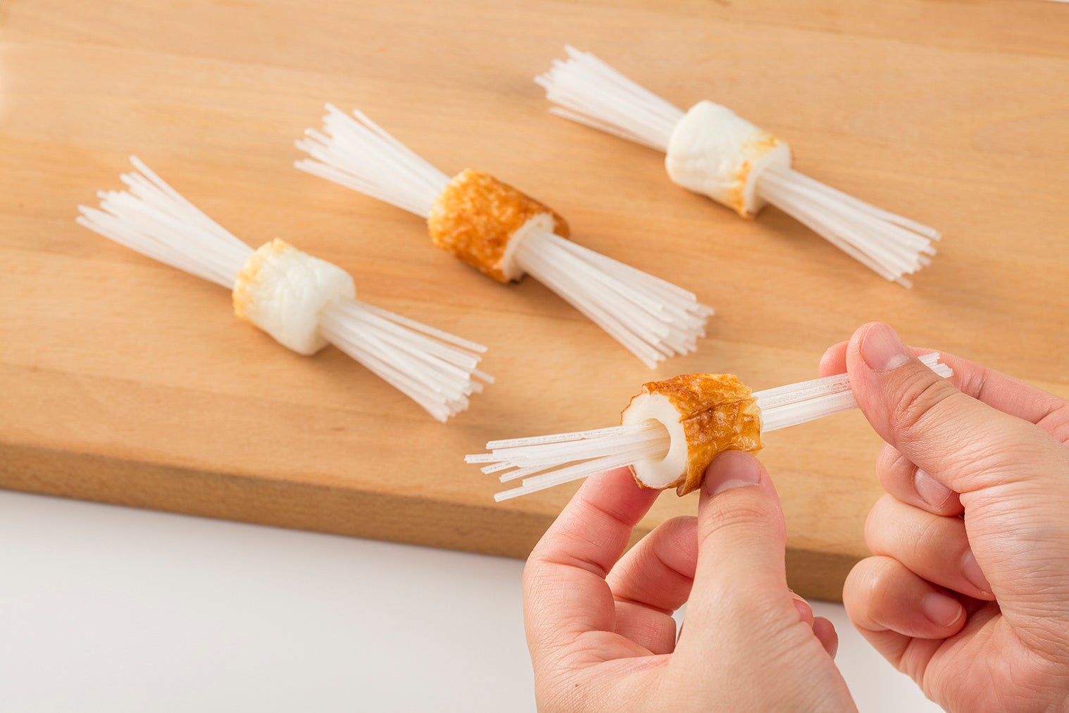 ②ちくわの穴にマロニーちゃんを抜けないようにしっかり詰め、マロニーちゃんの中央にちくわがくるようにします。(ちくわの他、ウインナーソーセージやうずらの卵にさしてもおいしくいただけます)