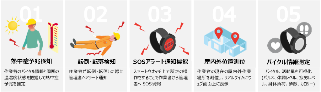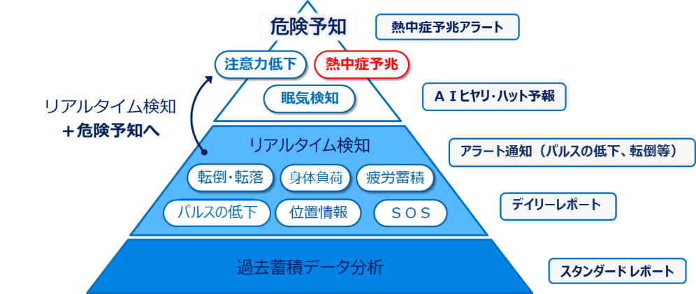 転倒・転落や各種体調変化のリアルタイム検知に加え、バイタルや活動量データから熱中症予兆や注意力低下などの「危険予知」を行い、労災事故の「未然予防」を目指す