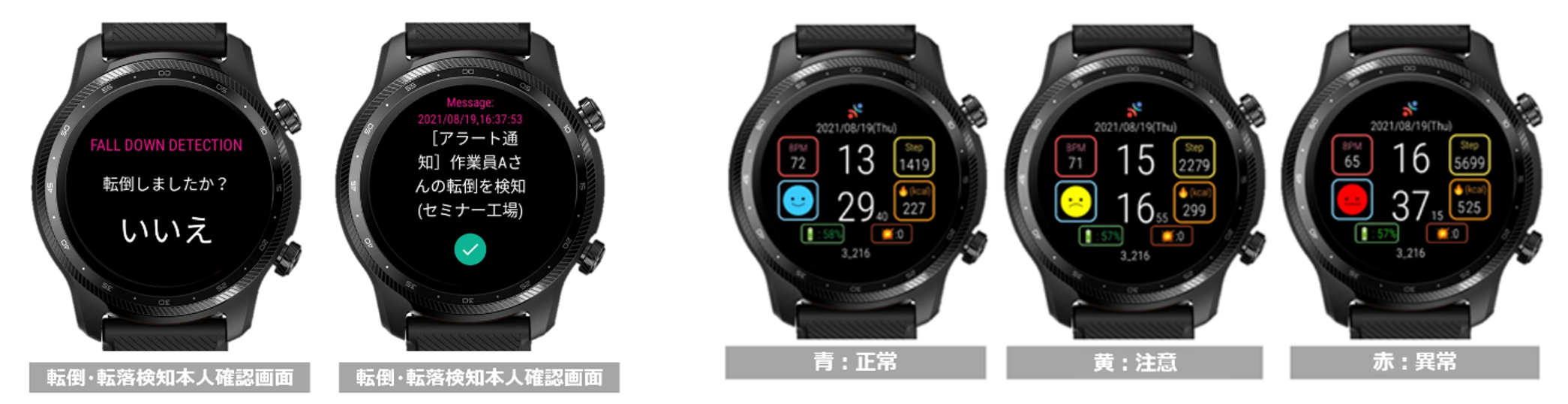 ☑転倒・転落検知の本人確認画面・通知 ☑体調レベルの変化通知