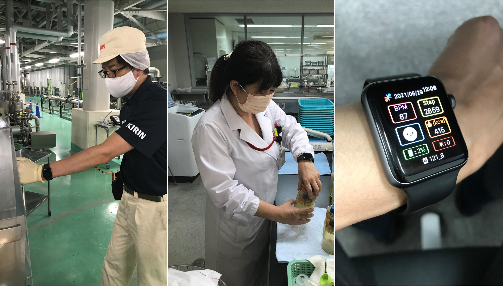 キリンビール神戸工場、キリンディスティラリー富士御殿場蒸溜所では、2021年7月~10月にかけて実証実験を実施し、1工場あたり6名が業務時間内にスマートウォッチを着用し、「Work Mate」の「転倒検知」「健康検知(熱中症予兆検知、体調変化の検知)」「操作性」の3項目の検証をしました。