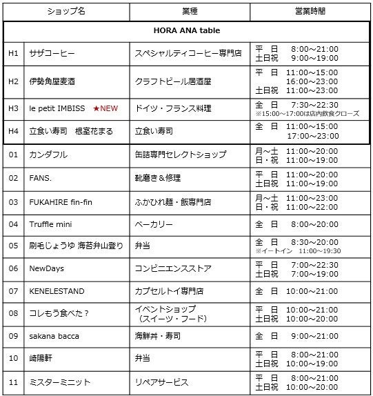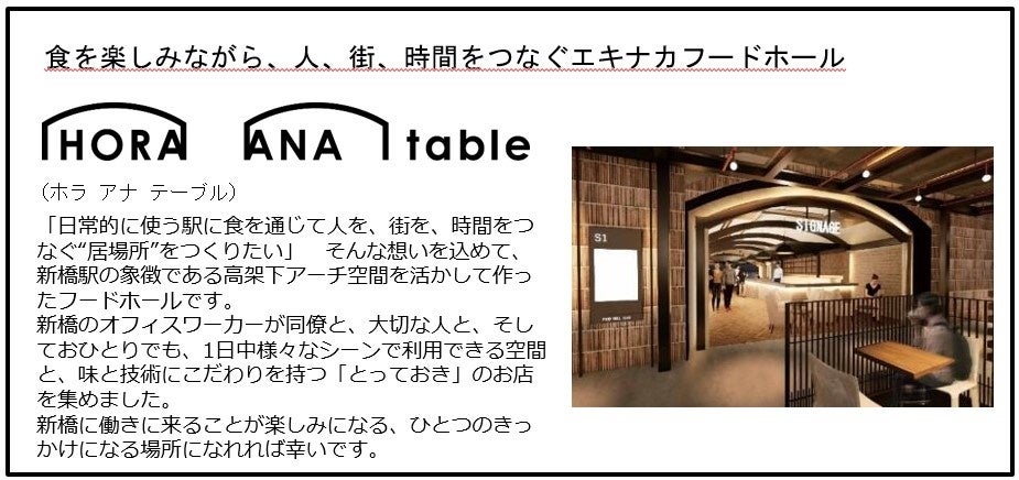 「HORA ANA table」は、スペシャルティーコーヒー専門店、旬の食材を厳選した鮮度抜群の立食い寿司や樽生ビールが味わえるクラフトビール居酒屋など、味と技術にこだわりを持つ「とっておき」のショップが揃うエキナカフードホールです。新橋駅の象徴である高架下アーチを活かした空間で「とっておき」の時間をお過ごしください。