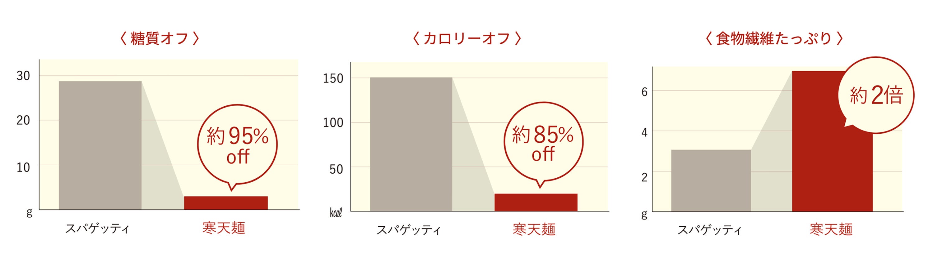 寒天主体の麺は糖質、カロリーが低くヘルシーなのに、満足感たっぷり。食物繊維も摂ることができます。