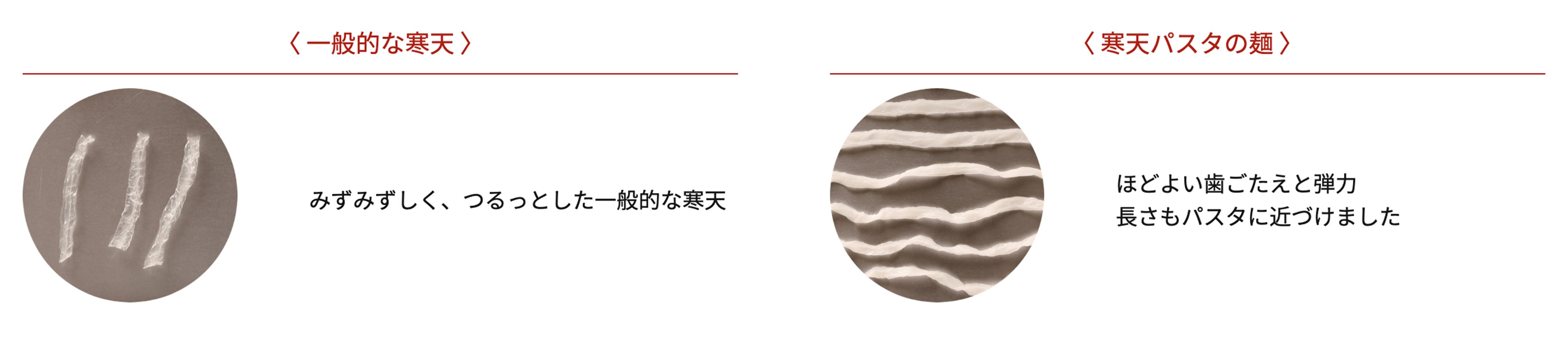 生パスタのような長さ、食感、風味を目指し、食感にこだわり研究すること約3年、まるで生パスタのような食感と長さに近づけました。麺は太めの「フェットチーネ」に近い形にし、コクのあるソースと相性の良い「寒天パスタ」に仕上げました。
