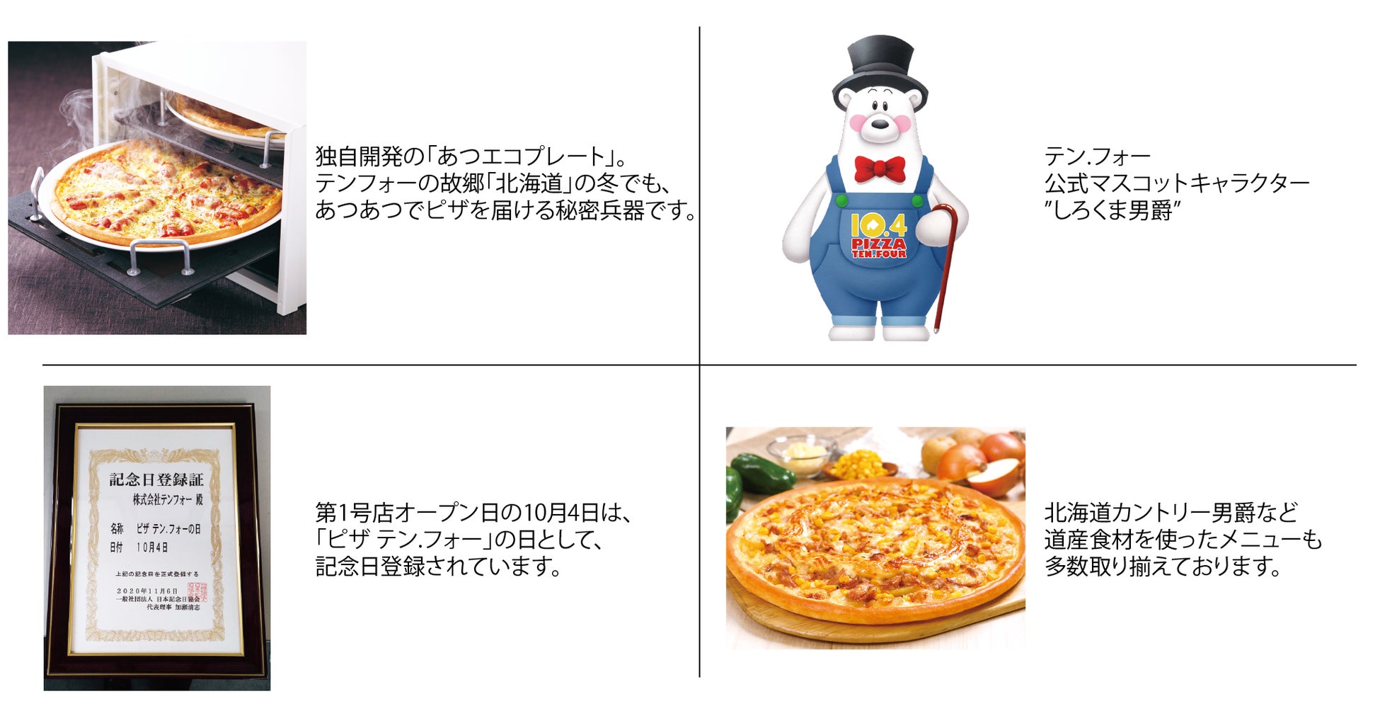 ・第1号店オープン日の10月4日は、「ピザ テン.フォー」の日として、記念日登録されています。