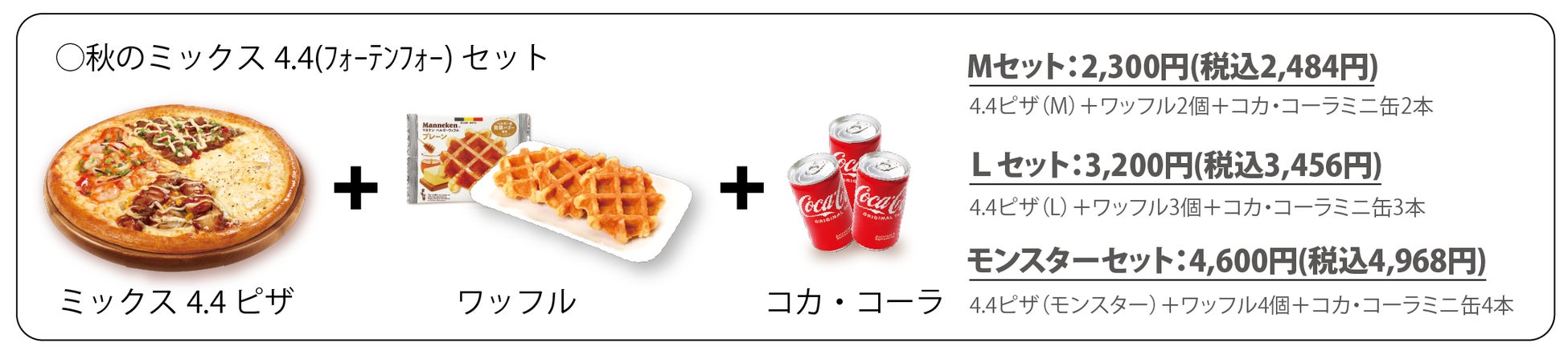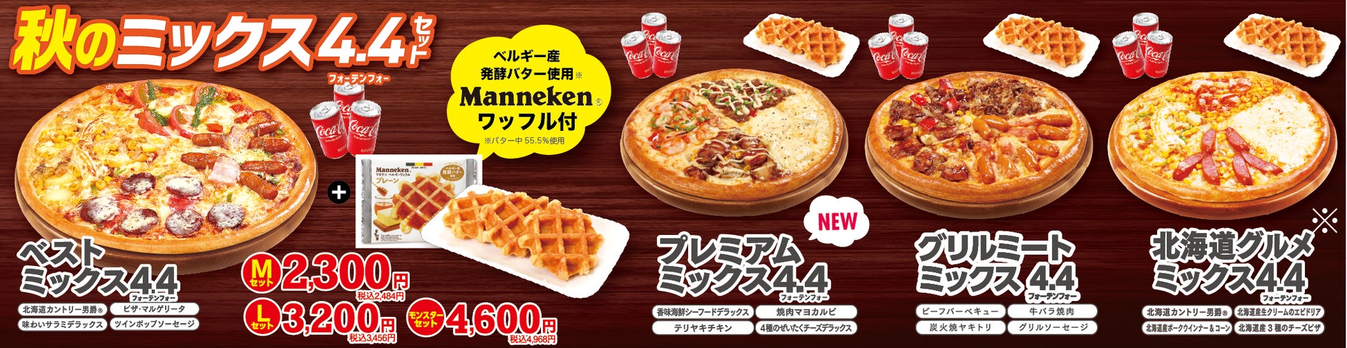 4種のピザが1枚で楽しめるお得な「ミックス4.4(フォーテンフォー)セット」が秋バージョンにリニューアル!定番4種の「ベストミックス4.4」他2品に加え、贅沢4種の「プレミアムミックス4.4」が新登場。ベルギー産発酵バターを使用した(※)「マネケンプレーンワッフル」とドリンクがどの4.4ピザにももれなくついてくるお得なセットです。お手頃Mサイズから日本最大級!?直径45cmモンスターサイズまでシーンに合わせて幅広くご利用いただけます。