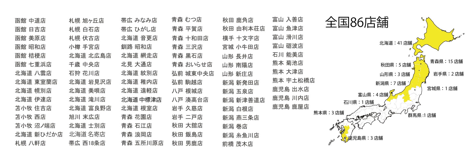 :全国86店舗中、北海道内41店舗。北海道の出店市町村数圧倒的NO.1!(自社調べ)