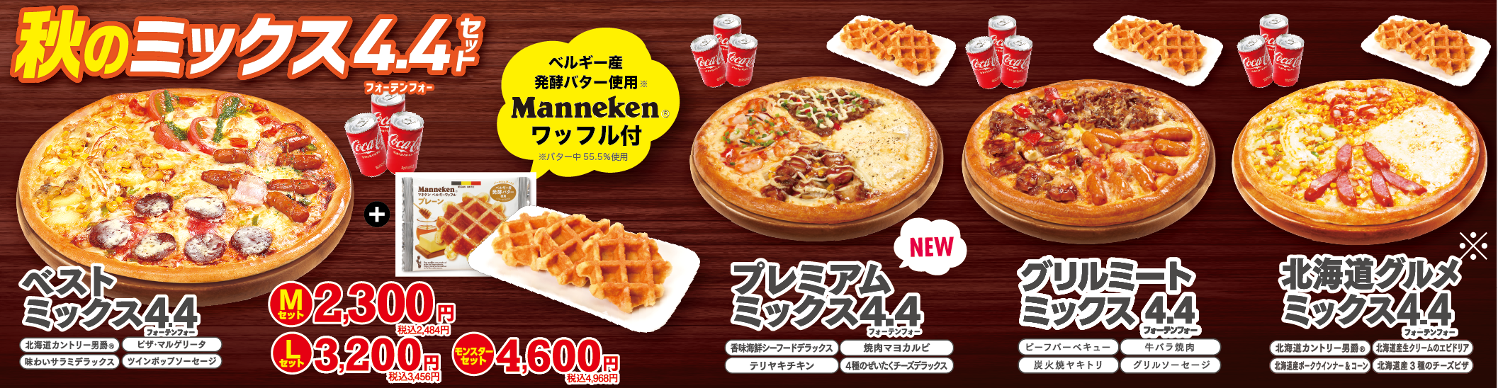 4種のピザが1枚で楽しめるお得な「ミックス4.4(フォーテンフォー)セット」が秋バージョンにリニューアル!定番4種の「ベストミックス4.4」他2品に加え、贅沢4種の「プレミアムミックス4.4」が新登場。ベルギー産発酵バターを使用した(※)「マネケンプレーンワッフル」とドリンクがどの4.4ピザにももれなくついてくるお得なセットです。お手頃Mサイズから日本最大級!?直径45cmモンスターサイズまでシーンに合わせて幅広くご利用いただけます。