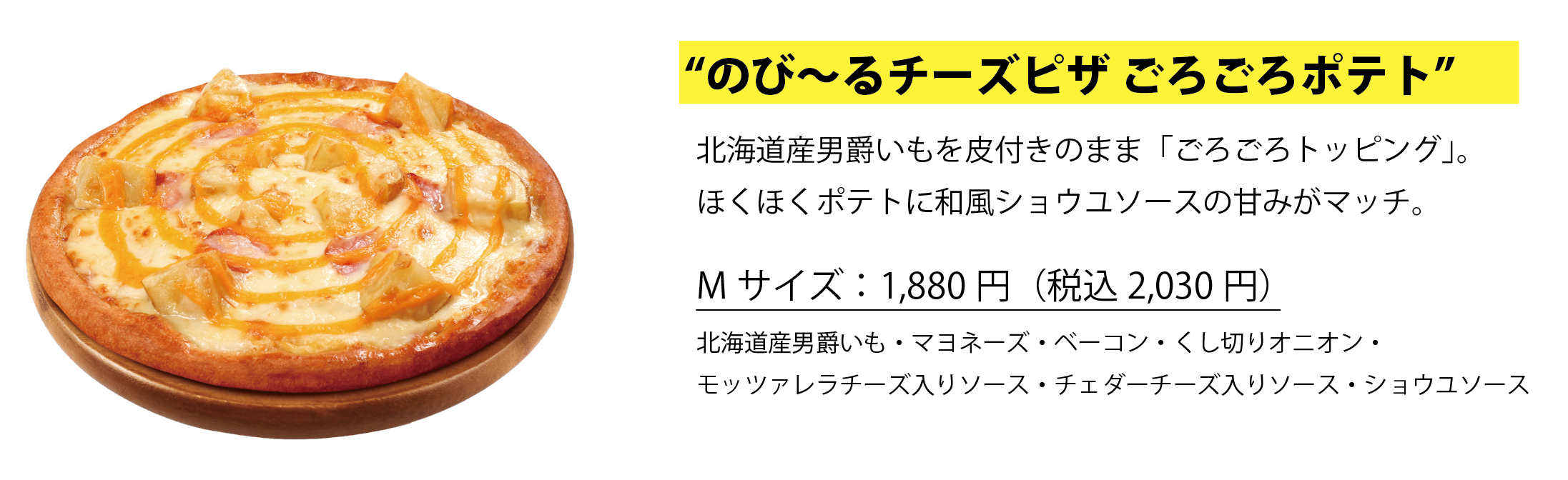 北海道産男爵いも・マヨネーズ・ベーコン・くし切りオニオン・モッツァレラチーズ入りソース・チェダーチーズ入りソース・ショウユソース