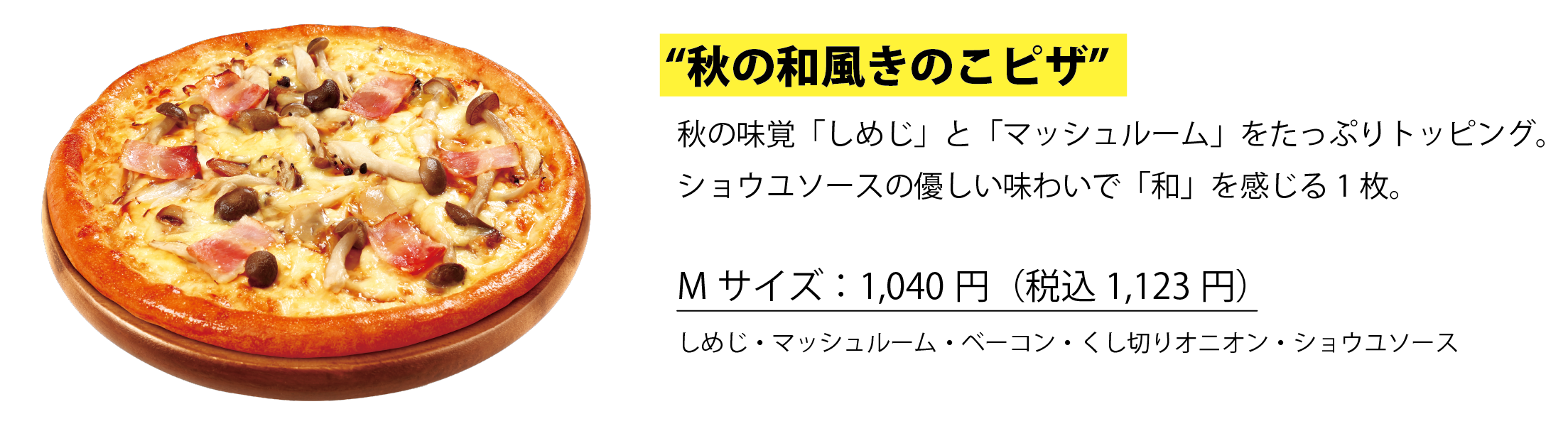 Mサイズ1枚1,040円(税込1,123円)テンフォーピザシリーズに秋限定新ピザ登場!しめじとマッシュルームのダブルきのこがたっぷり。和風ソースで優しい味わい。“秋の和風きのこピザ”で秋の訪れを感じてみるのはいかが。