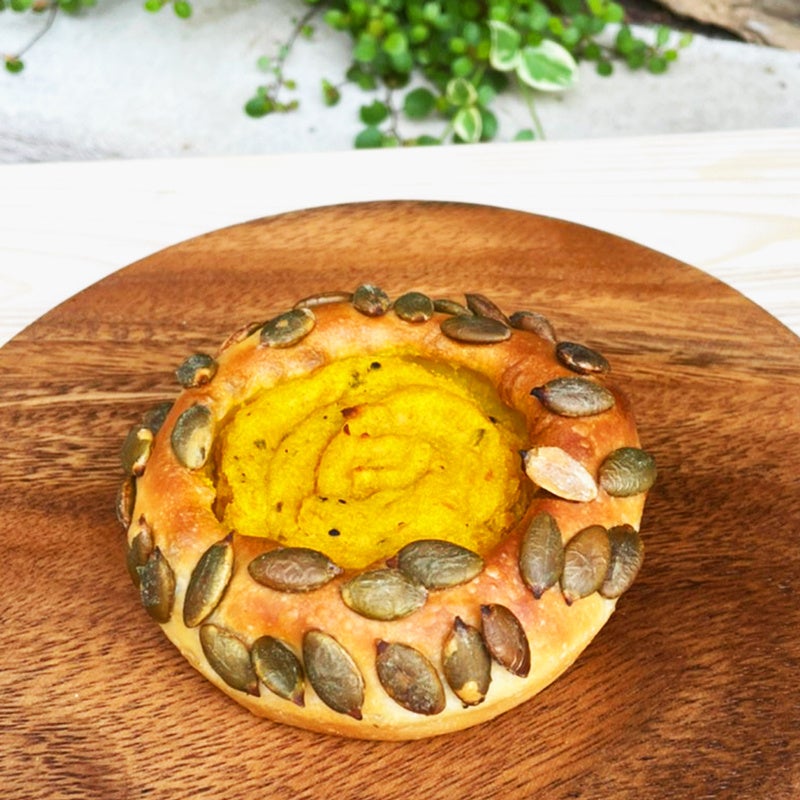 “いのうえのうえん”さんのかぼちゃ【伯爵】と、自家製カスタードクリーム、アーモンドクリームのおやつパン。
