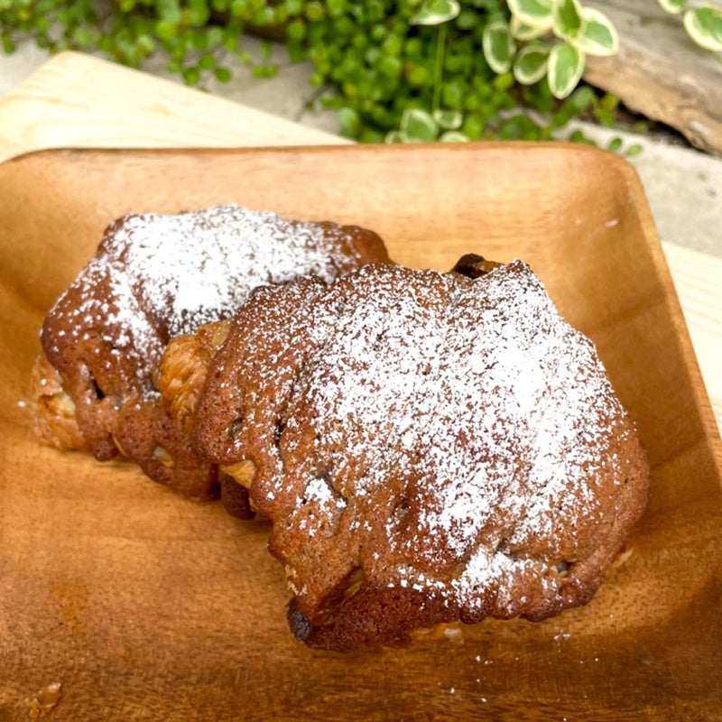 有機カカオを使用したアーモンドクリームと甘栗、チョコレート入り。カカオラングドシャをかけて焼き上げました。