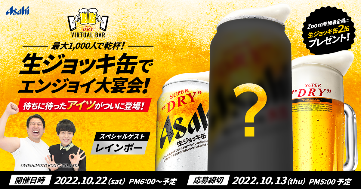 「生ジョッキ缶でエンジョイ大宴会!〜待ちに待ったアイツがついに登場!〜ASAHI SUPER DRY VIRTUAL BAR」は、『アサヒスーパードライ 生ジョッキ缶大生(だいなま)』(缶485ml)を10月25日から発売することを記念して開催するオンラインイベントです。人気お笑いコンビ「レインボー」のジャンボたかおさんと池田直人さんが参加し、最大1,000名による「生ジョッキ缶」での乾杯や一般のお客さまも参加できるミニゲームを実施するなど、イベントの盛り上げを図ります。