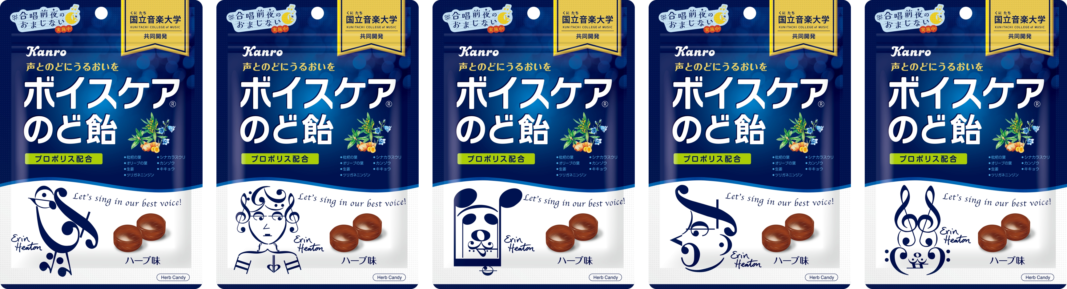また、「連食しやすく、カバンに入れても中身が出ないジッパー付きのパッケージがいい」というご意見をいただいていたことや、近年、環境問題への関心が非常に高まっており、個包装を廃止することでプラスティックゴミを削減できることから、このたび個包装のゴミが出ないラミジップタイプを新発売することにいたしました。パッケージは、引き続き、音符や音楽記号を使ったグラフィック作品で有名なエリン・ヒートンのデザイン全5種で展開します。