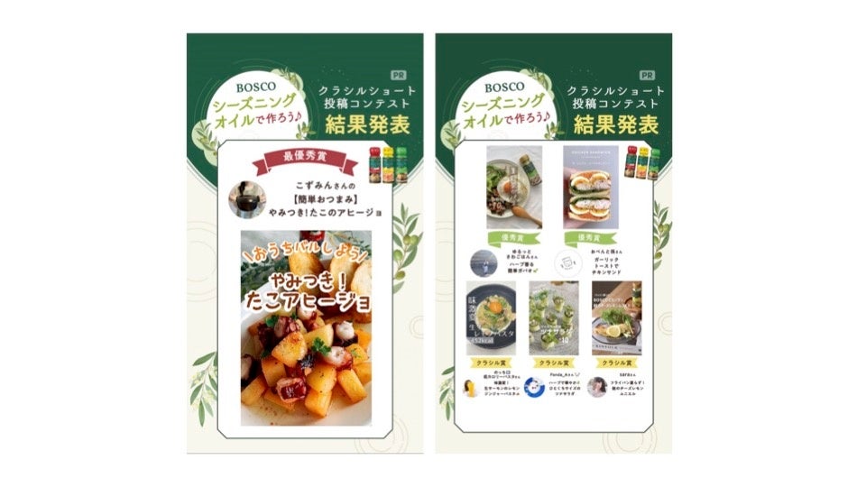 国内No.1のレシピ動画プラットフォーム(※1)「クラシル」は、ショート動画投稿機能を活用した広告メニュー「クラシルショート イベントタイアップ」を用いて、「BOSCO シーズニングオイル」のプロモーションを実施しました。