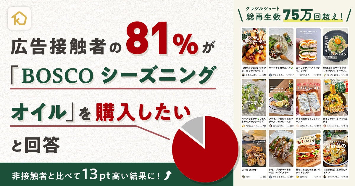 施策後のブランドリフト調査で、広告接触者の81%が『「BOSCO シーズニングオイル」を購入したい』と回答し、食に関心が高いユーザーの購入意欲を高める結果となりました。