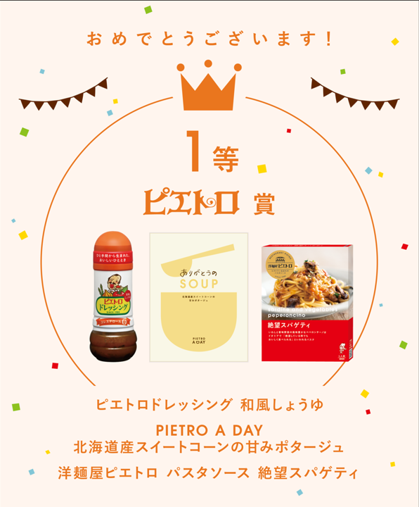 「ピエトロドレッシング 和風しょうゆ」、「PIETRO A DAY 北海道産スイートコーンの甘みポタージュ」、「洋麺屋ピエトロ パスタソース 絶望スパゲティ」