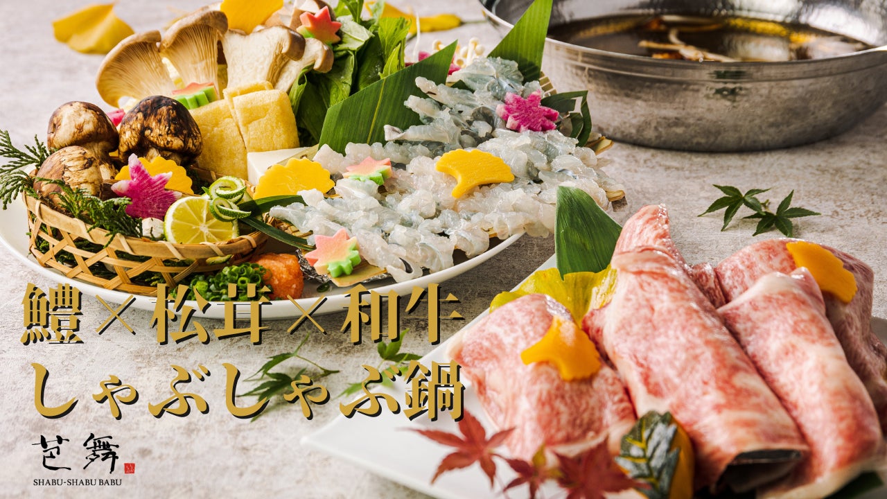 鱧の白、松茸の茶や和牛の赤色で白秋をイメージした「鱧×松茸×和牛しゃぶしゃぶ」。出汁と食材の旨みを存分に味わえる鍋です。