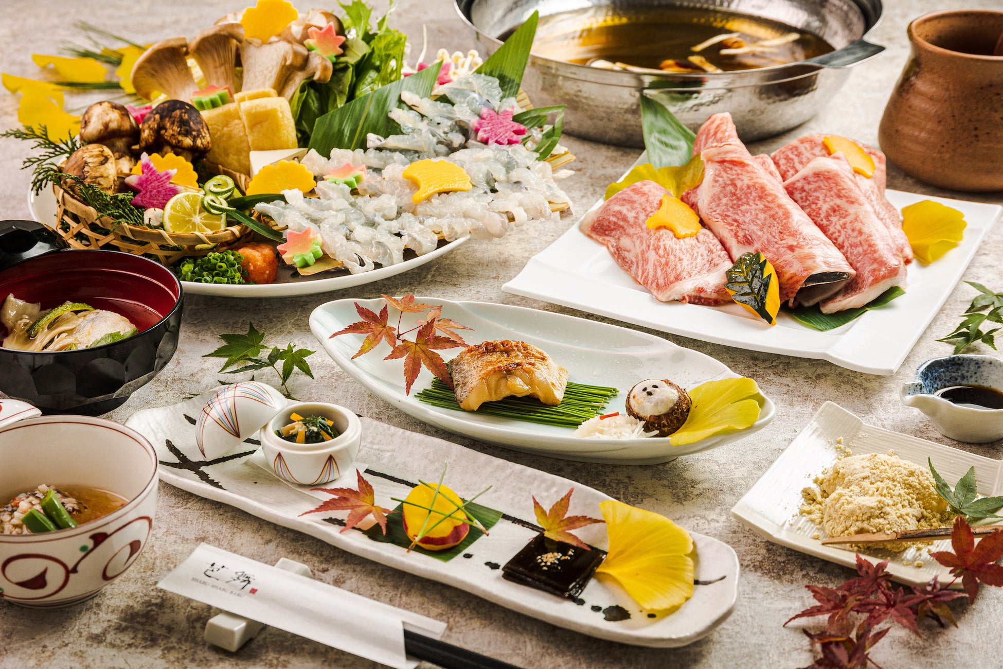 鍋と季節の食材を使った会席が一緒に味わえる贅沢な「~白秋~会席の鱧×松茸×和牛しゃぶしゃぶコース」です。