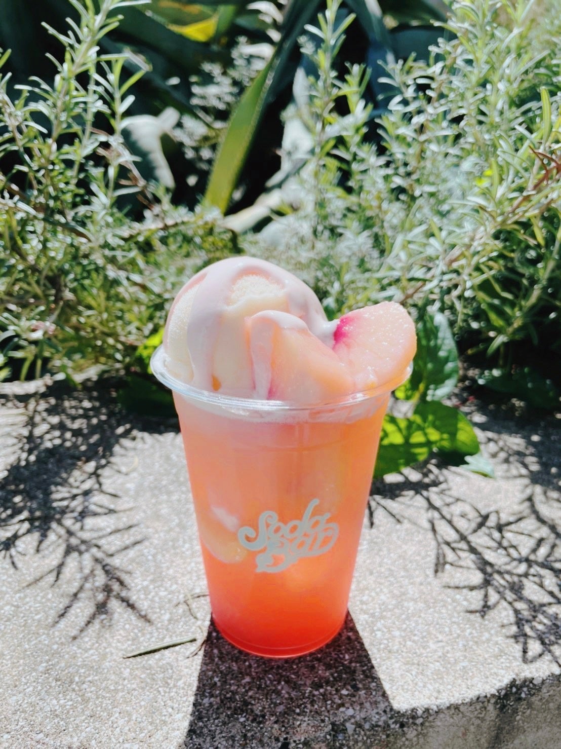 国産のすももと桃の自家製シロップのソーダに、桃のグラニテとコンポート、桃のシャーベットをトッピングした、桃づくしの贅沢なドリンクです。