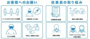 政府及び関係各所からの発表や指導に基づき、ご利用いただく皆 様に安心して快適にお過ごしいただけますう、衛⽣管理の強化 や感染防止対策に取り組んでおります。従業員の対策はもちろ ん、ご来場のお客様にも感染防止対策のご協力をお願いいたします。
