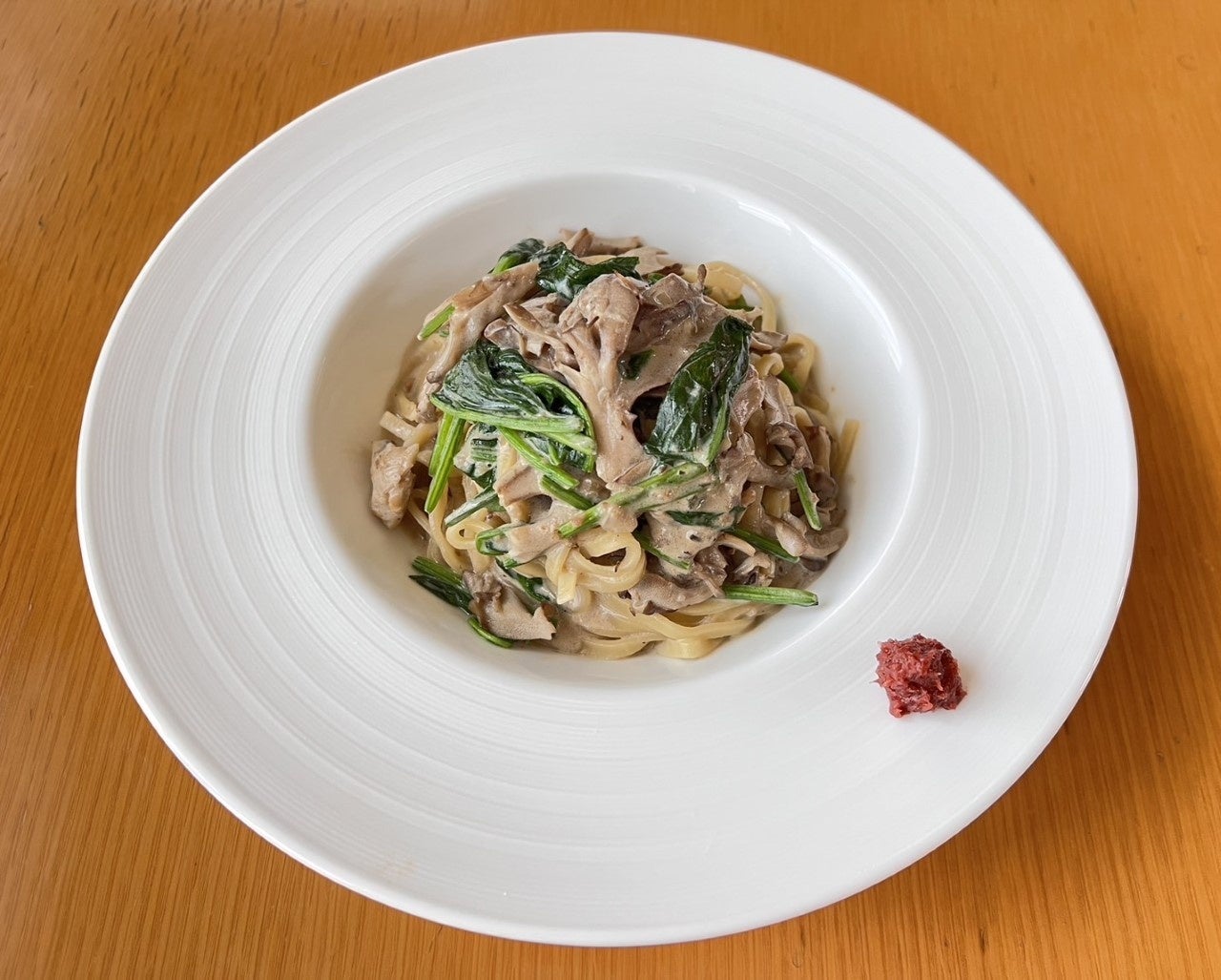 <九頭⻯マイタケの和風⾖乳パスタ>