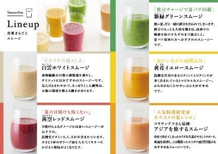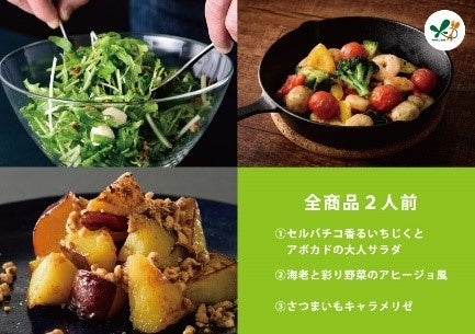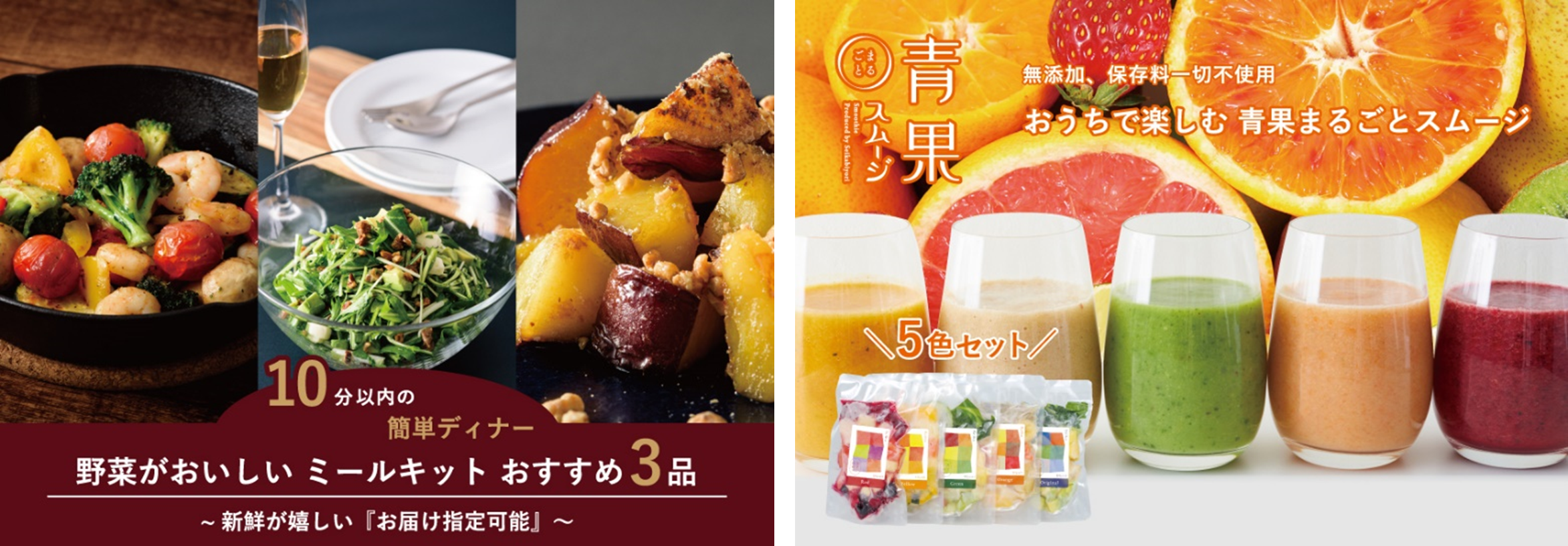 「野菜がおいしい ミールキット おすすめ3品」は、10分以内の簡単調理が可能で新鮮野菜が楽しめる「セルバチコ香るいちじくとアボカドの大人サラダ」、「海老と彩り野菜のアヒージョ風」、「さつまいもキャラメリゼ」の3品が詰め合わせに。「おうちで楽しむ青果まるごとスムージ」は、無添加、保存料を一切不使用の「アジアを旅するスムージ」、「白雲ホワイトスムージ」、「茜空レッドスムージ」、「新緑グリーンスムージ」、「黄花イエロースムージ」の5つがセットになります。