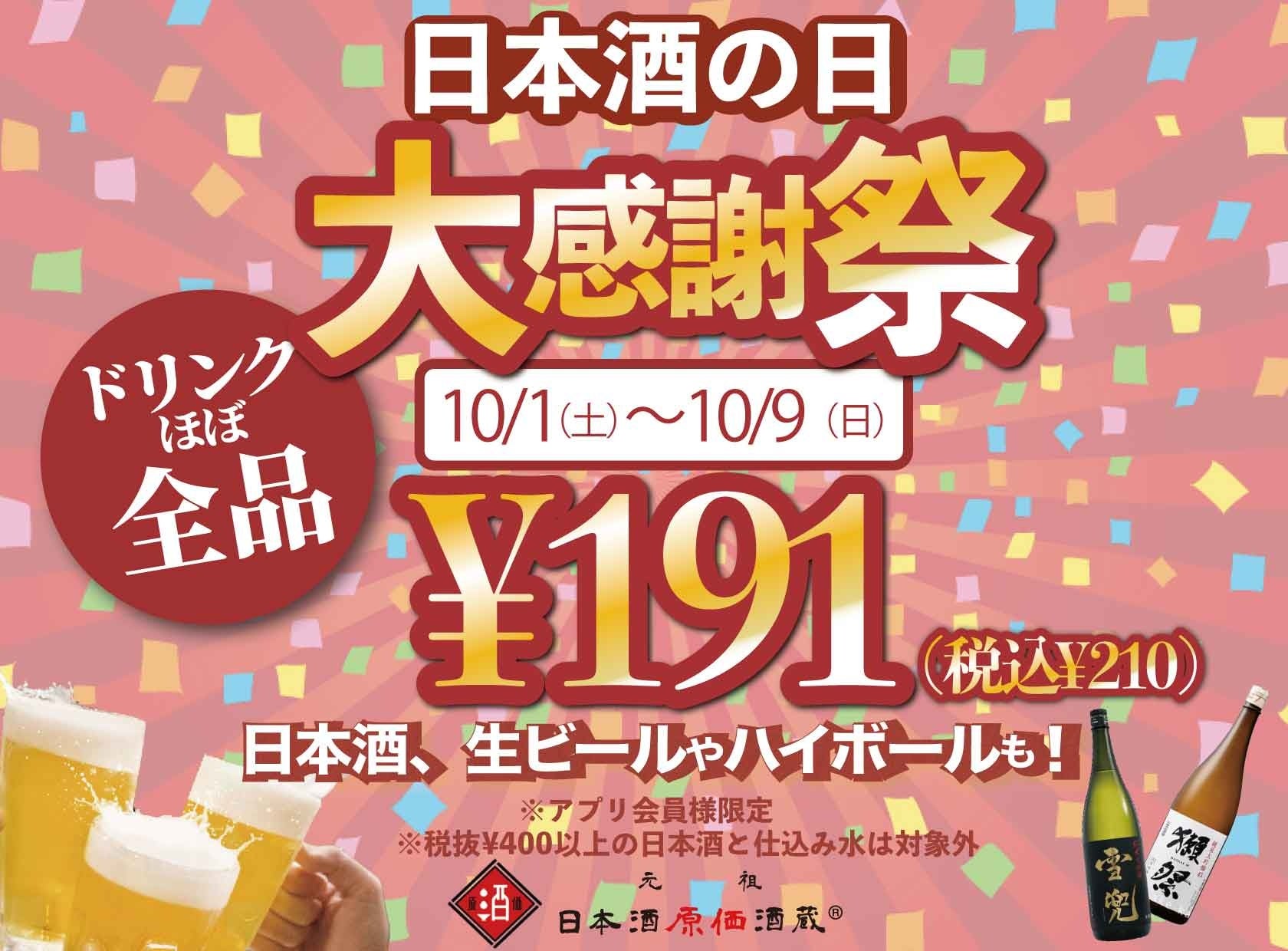 株式会社クリエイティブプレイス(本社:東京都品川区 代表:中村雄斗)が運営する日本酒原価酒蔵では、日本酒の日を記念して全店舗にて10月1日(土)~10月9日(日)の期間、ドリンクほぼ全品が¥191(税込¥210で)飲めるキャンペーンを開催します。