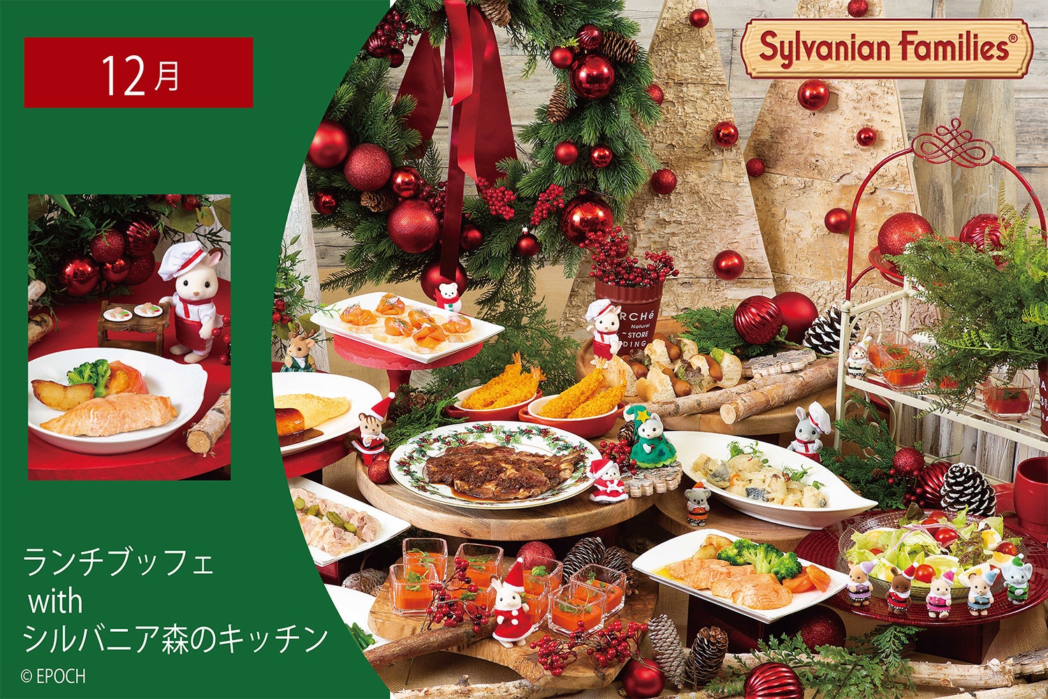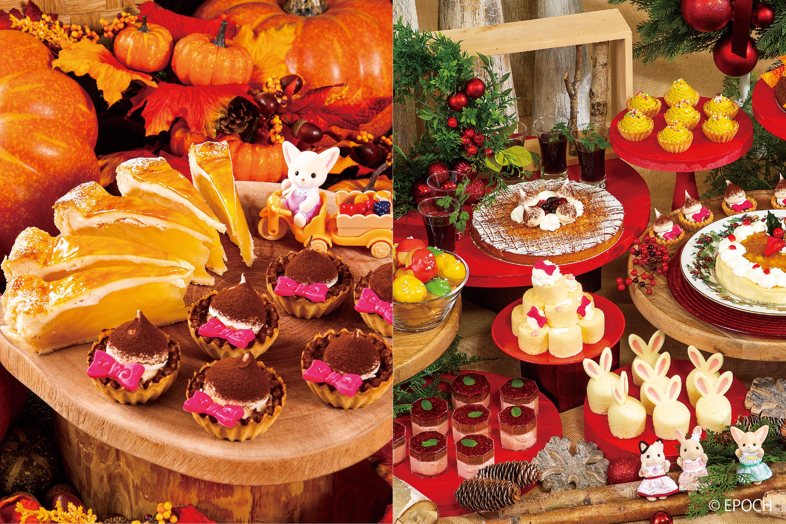 今回のランチブッフェは9月から始まった本イベントの第1弾、パティシエが創作したスイーツが並ぶ「スイーツブッフェ with シルバニアファミリー」に続く第2弾として展開し、料理長がシルバニア村の物語から想像をふくらませたお料理を中心とした「ランチブッフェ」をご用意いたしました。11月は「マルシェで楽しむ秋の収穫祭」をテーマに平日の火曜日から金曜日限定で開催し、12月は「わくわくクリスマスパーティ」をテーマに平日・土・日曜日(※月曜除く)に開催いたします。お料理やお飲物はもちろんのこと店内装飾もテーマに沿った世界観を表現し、月替りで訪れる楽しみも増やしました。